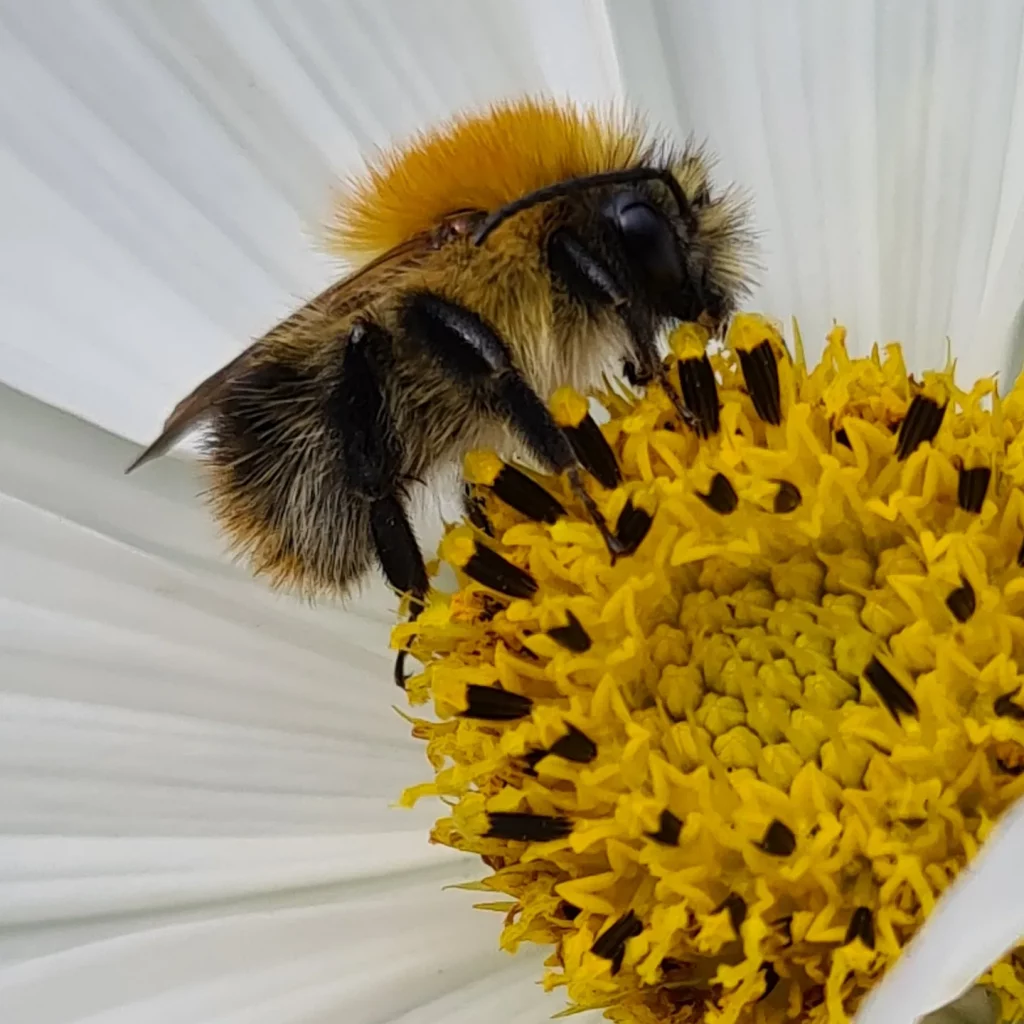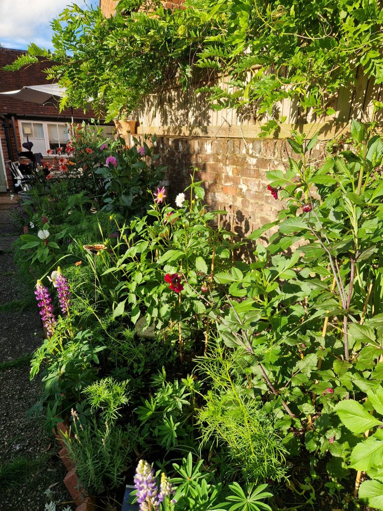 The tall pure white Cosmos and their soft foliage tickled my face. They were taller than I had remembered. The petals cupped a bumblebee giving it a safe haven to rest and gorge on the pollen. My sandalled feet crunched on the gravel as I made my way down the path.